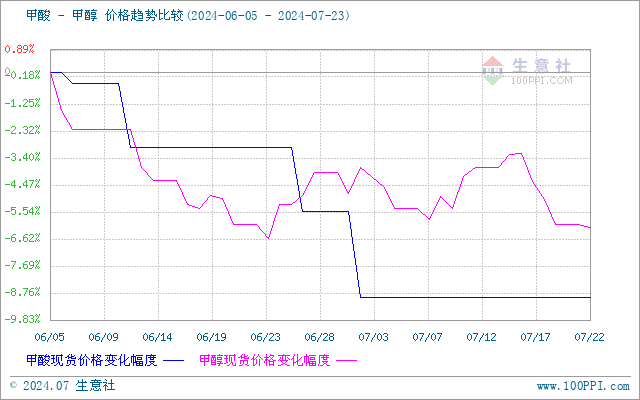 據生意社行情分析系統顯示,截止到7月23日甲酸企業報價均價為2678元/噸,與上月同期價格相比下跌6.02%,與7月初價格相比下跌3.53%,與上周相比價格穩定。